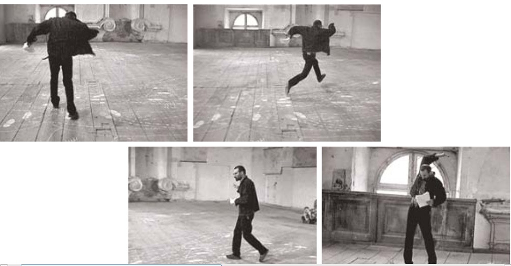 "На основании скрупулезного текстологического анализа "Илиады" я составил таблицу. В левом вертикальном столбце приведены имена всех ахейских вождей, по горизонталям – имена убитых каждым из них троянцев с конкретизацией способа поражения (в голову, в шею, в плечи, грудь и т.д.). Далее были составлены схемы – на условном контуре тела (так сказать, тела "неизвестного троянского солдата") отмечались поражения всех троянцев, убитых, предположим, Ахиллесом или Аяксом, Одиссеем, Диомедом и т.д. Одновременно это являлось и подобием танцевальных схем, где направления ударов – скажем, копья, вошедшего в грудь и вышедшего из спины, – маркировались как позиции левой и правой ступней. И, наконец, увеличив эти схемы на полу, я сам пробовал протанцевать каждый из таких танцев, всякий раз под одну и ту же очень "европейскую" бравурную, героическую музыку (отрывок из 5-й симфонии Шуберта)” (https://monoskop.org/images/c/cc/Kovalev_Andrey_ed_Rossiyskiy_aktsionizm_1990-2000.pdf).